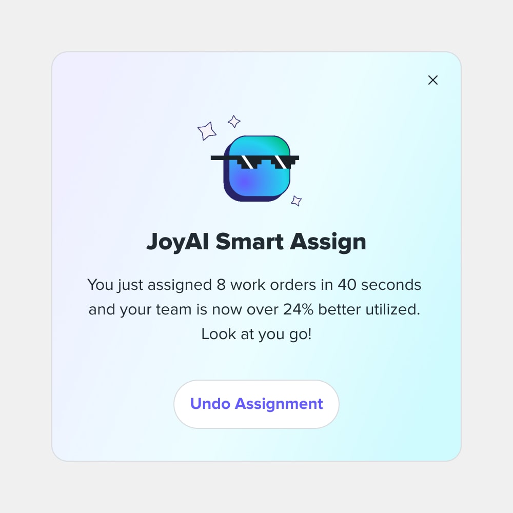 I led the end-to-end design of a new kanban board for centralised maintenance teams. It incorporates the known usability benefits of kanban, accounts for technician capacity and availability, plus utilises JoyAI↗︎ for assignment suggestions and our algorithmic optimisation feature; Smart Assign.